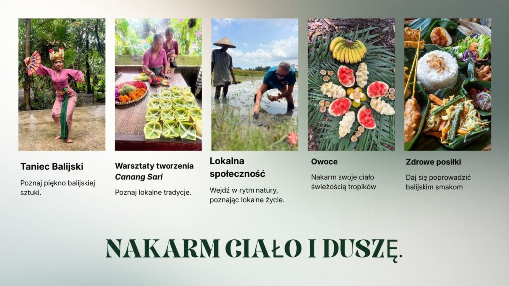 Dzień 9: Poranna praktyka, tradycyjna balijska wioska: rytuały, rzemiosło, jak robi się olej kokosowy, nauka tworzenia podarunków dla Bogów, taniec balijski, obiad balijski, opcjonalnie warsztaty tworzenia biżuterii.